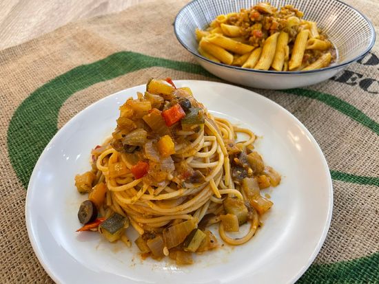 🍝《摩洛哥風味肉醬》 來自北非的摩洛哥獨特風味料理。 野食自製摩洛哥香料,使用多種天然香料及肥瘦適中的台灣溫體豬絞肉,燉煮成多層次有別於一般肉醬(摩洛哥人不吃豬肉,當地人以牛絞肉製作肉醬,但由於台灣有些人不吃牛肉,因此改為豬絞肉替代)。 🍆《普羅旺斯燉菜》 普羅旺斯燉菜是一道傳統法式蔬菜料理,使用櫛瓜、紅椒、黃椒、茄子、西芹、黑橄欖、酸豆、自製紅醬及多種香料...等食材, 先炒再燉,不僅能嚐到各種食材原有的風味,合再一起吃又是另一種風貌